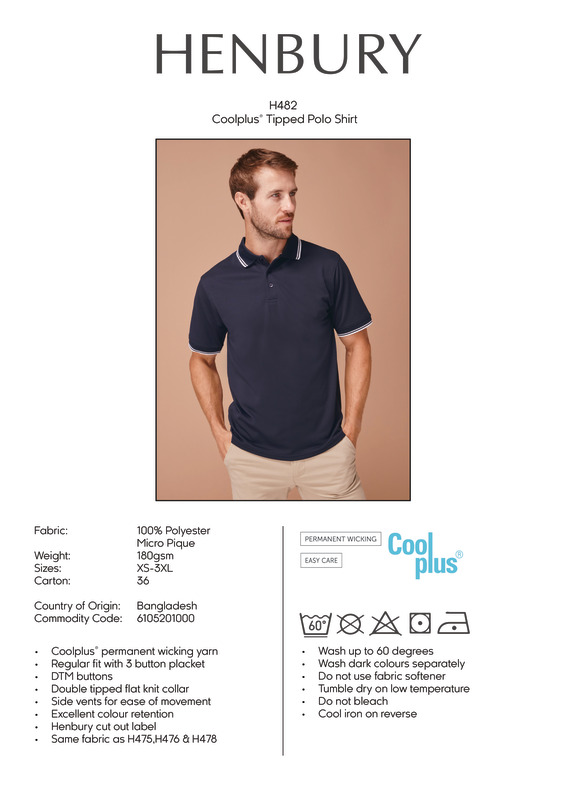 If you're looking for a smarter polo that’s built to perform, look no further. This Double tipped Coolplus® polo shirt will keep you looking smart and will keep you cool and fresh all day.Micro piqué with Double tipped with flat knit collar and 1x1 ribbed cuffs3 dyed to match buttonsSide vents for ease of movementWicking yarn for prolonged performanceExcellent colour retentionMinimum ironingEasycareBSCI certified.Accreditations: Amfori BSCIAge Group: AdultFabric: 100% Polyester micro piquéGender: MalePlus Size: YesProduct Type: PolosSize Range: XS to 3XLSizing To Fit: XS 34/36″ S 36/38″ M 38/40″ L 42″ XL 44/46″ 2XL 48″ 3XL 50/52″Tag: Sewn TagWashing Instructions: 40 synthetic. Do not bleach. Low tumble dry. 1 dot iron. Do not dry clean. Wash at 40 degrees synthetic cycle. Wash dark colours separately. Do not use Fabric Softner.Tumble dry Low Temperature. Cool iron on reverse.Weight (GSM): 180gsm]]>