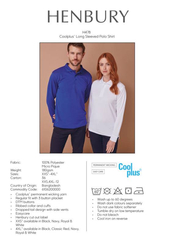 Stay cool and fresh in our Coolplus® permanent wicking long-sleeved polo shirt. In a unisex fit, you can be sure this polo shirt will perform and keep the whole workforce uniformed.Coolplus® wicking Long sleeve polo shirtMicro piqué with Flat knit collar and 1x1 Ribbed cuffsSide vents for ease of movementWicking yarn for prolonged performanceExcellent colour retentionMinimum ironingEasycareBSCI certified.Accreditations: Amfori BSCIAge Group: AdultFabric: 100% Polyester micro piquéGender: UnisexPlus Size: YesProduct Type: PolosSize Exclusions: *XXS only available in these colours. †4XL only available in these coloursSize Range: XXS to 4XLSizing To Fit: XXS* 32/34″ XS 34/36″ S 36/38″ M 38/40″ L 42″ XL 44/46″ 2XL 48″ 3XL 50″ 4XL† 52″Tag: Sewn TagWashing Instructions: 40 synthetic. Do not bleach. Low tumble dry. 1 dot iron. Do not dry clean. Wash at 40 degrees synthetic cycle. Can be washed up to 60 degrees. Wash dark colours separately. Do not use Fabric Softner. Tumble dry Low Temperature. Cool iron on reverse.Weight (GSM): 180gsm]]>