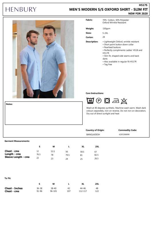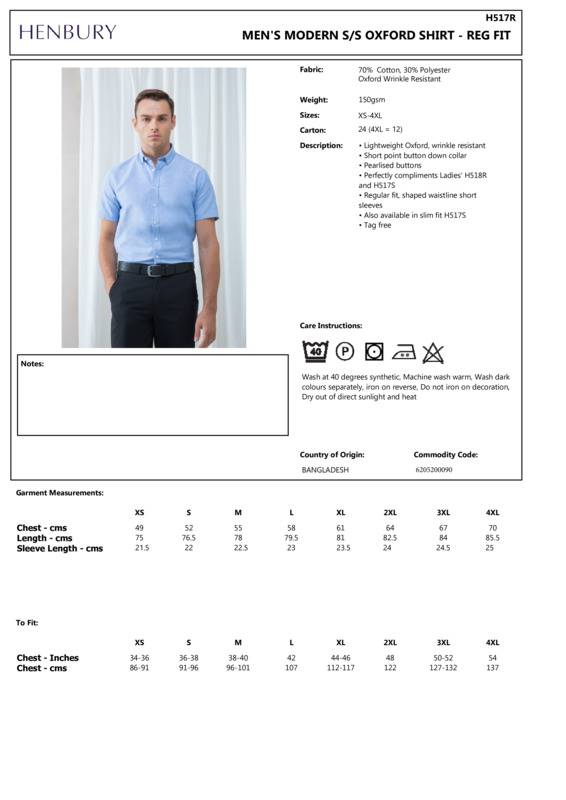 Offered in regular fit, this shirt perfectly matches our HB512 range. This style contains wrinkle-resistant properties for easy maintenance and comes tag free to allow for easy rebranding. Keep the look all year round with our short-sleeved regular fit shirt.Modern fit, button-down Oxford shirt available in Regular and Slim fitCotton-rich lightweight Oxford with wrinkle resistant finishShort point collarPearlised buttonsWRAP certifiedSEDEX certifiedBSCI certified.Accreditations: Amfori BSCI|Sedex|WRAPAge Group: AdultFabric: 70% Cotton, 30% Polyester, lightweight Oxford weaveGender: MaleLeg Length: Regular, SlimPlus Size: YesProduct Type: ShirtsSize Exclusions: *Only Regular available in 3XL and 4XLSize Range: XS to 4XLSizing To Fit: XS 34/36″ S 36/38″ M 38/40″ L 42″ XL 44/46″ 2XL 48″ 3XL* 50/52″ 4XL* 54″Tag: Sewn TagWashing Instructions: Do Not Bleach. Tumble Dry Low. 2 Dot Iron. P Dry Clean. Wash at 40 degrees synthetic. Wash Dark Colours Separately. Dry Out of Direct Heat and Sunlight. Iron on Reverse. Machine wash warm. Do not iron on decoration.Weight (GSM): 150gsm]]>