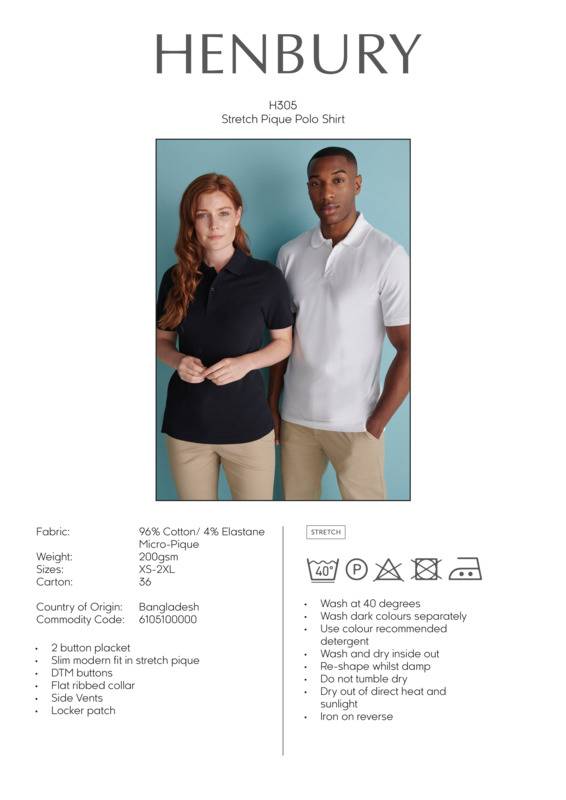 Add our cotton stretch piqué to your corporate wardrobe. Its stretch qualities allow for added comfort and movement which provides the perfect addition to your choice of uniform.Stretch pique fabric in a slim fitting style with flat knit collar2-button placket with dyed to match buttons with side vents for ease of movementSEDEX certifiedOeko-Tex certifiedBSCI certified.Accreditations: Amfori BSCI|Oeko-Tex|SedexAge Group: AdultFabric: 96% Cotton, 4% Elastane stretch micro-piquéGender: UnisexPlus Size: NoProduct Type: PolosSize Range: XS to 2XLSizing To Fit: XS 34″ S 36″ M 38/40″ L 42″ XL 44/46″ 2XL 48″Tag: Sewn TagWashing Instructions: 40 synthetic. Do not bleach. Do not tumble dry. 2 dot iron. P dry clean. Wash at 40 degrees synthetic cycle. Wash dark colours separately. Use colour recommended detergent. Re-shape while damp. Do not tumble dry. Dry out of direct heat and sunlight. Iron on reverse.Weight (GSM): 200gsm]]>