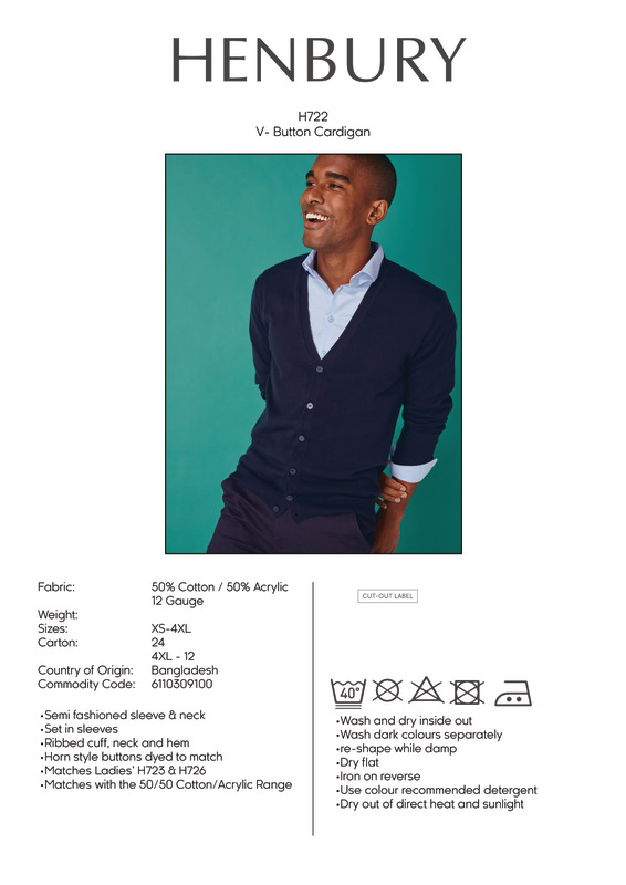 This V-button cardigan offers that traditional style with self-coloured horn effect buttons in a quality fine knit made to perform, offered in a range of corporate colours. This style is part of our 50 cotton/50 acrylic range where you can mix and match your styles.Fine knit 12 gaugeSemi fashioned sleeves and neck detailHorn effect dyed to match buttons1 x 1 neck, and cuff ribSEDEX certifiedOeko-Tex certifiedBSCI certified.Accreditations: Amfori BSCI|Oeko-Tex|SedexAge Group: AdultFabric: 50% Cotton, 50% AcrylicGender: MalePlus Size: YesProduct Type: CardigansSize Range: XS to 4XLSizing To Fit: XS 34/36″ S 36/38″ M 38/40″ L 42″ XL 44/46″ 2XL 48″ 3XL 50/52″ 4XL 54″Tag: Sewn TagWashing Instructions: Do not bleach. Do not tumble dry. 2 dot iron. Do not dry clean. Wash at 40 degrees. Wash dark colours separately. Wash and dry inside out. Dry flat. Use colour recommended detergent. Re-shape while damp. Dry out of direct heat and sunlight. Iron on reverse.Weight (GSM): 12 Gauge]]>