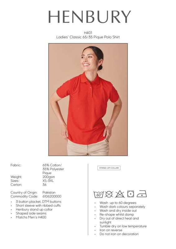 The Women's 65/35 polo is the perfect workwear solution. A comfortable modern fit in high quality fabric with the ability to wash at 60 degrees, this polo really does provide durability, functionality and quality.Stand up collar for increased shape retentionWashable at 60°C1x1 ribbed cuffs3 button placket with self-coloured buttonsSide vents.Worldwide Responsible Accredited Production (WRAP) certified productionWRAP certified.Accreditations: WRAPAge Group: AdultFabric: 65% Polyester, 35% CottonGender: FemalePlus Size: YesProduct Type: PolosSize Range: XS to 3XLSizing To Fit: XS 8 S 10 M 12 L 14 XL 16 2XL 18 3XL 20Tag: Sewn TagWashing Instructions: 40 synthetic. Do not bleach. Low tumble dry. 1 dot iron. Do not dry clean. Wash at 40 degrees synthetic cycle. Wash and dry inside out. Wash dark colours separately. Use colour recommended detergent. Re-shape while damp. Tumble dry low temperature. Dry out of direct heat and sunlight. Iron on reverse. Do not iron on decorationWeight (GSM): 200gsm]]>
