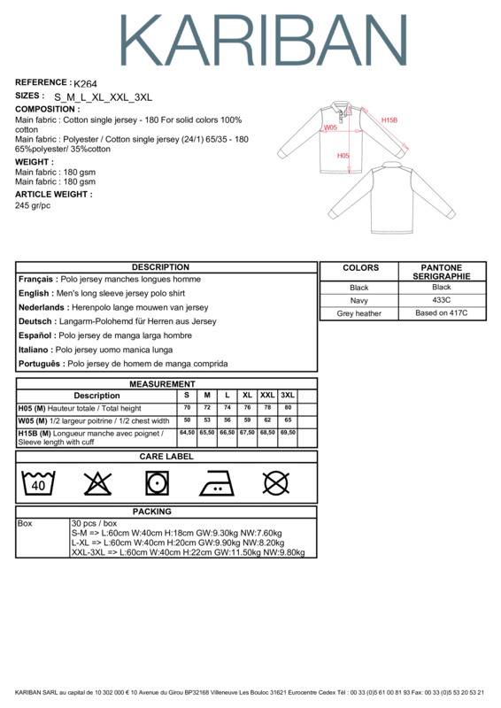 100% cotton (Grey Heather : 65% polyester / 35% cotton - Oxford Grey : 90% cotton / 10% viscose). Jersey knit fabric in combed cotton. Shirt collar. Placket with 3 metal buttons. Shoulder yoke. Ribbed cuffs. Twin needle finish at hem. Certified STANDARD 100 by OEKO-TEX®N° CQ1007/7, IFTH.Placket with 3 metal buttonsShoulder yokeRibbed cuffsTwin-needle finish at hemBSCI certifiedOeko-Tex certifiedSEDEX certified.Accreditations: Amfori BSCI|Oeko-Tex|SedexAge Group: AdultFabric: 100% Combed cotton. French Navy Heather: 80% Cotton, 20% Polyester. Grey Heather: 65% Polyester, 35% CottonGender: MalePlus Size: YesProduct Type: PolosSize Range: S to 3XLSizing To Fit: S 36″ M 38″ L 40″ XL 42″ 2XL 44/46″ 3XL 48/50″Tag: Sewn TagWashing Instructions: Washable at 40°. Do not bleach. Low temperature drying. Iron at max 110°C. No solvent.Weight (GSM): 180gsm]]>