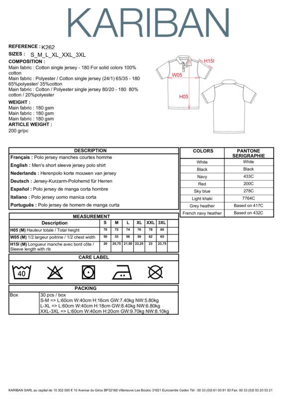 100% combed cotton (French Navy Heather : 80% cotton / 20% polyester - Grey Heather : 65% polyester / 35% cotton - Oxford Grey : 90% cotton / 10% viscose). Jersey knit fabric. Shirt collar. Placket with 3 metal buttons. Shoulder yoke. Ribbed cuffs. Twin needle finish at hem. Certified STANDARD 100 by OEKO-TEX®N° CQ1007/7, IFTH.Placket with 3 metal buttonsShoulder yokeRibbed cuffsTwin-needle finish at hemBSCI certifiedOeko-Tex certifiedSEDEX certified.Accreditations: Amfori BSCI|Oeko-Tex|SedexAge Group: AdultFabric: 100% Combed cotton. French Navy Heather: 80% Cotton, 20% Polyester. Grey Heather: 65% Polyester, 35% CottonGender: MalePlus Size: YesProduct Type: PolosSize Range: S to 3XLSizing To Fit: S 36″ M 38″ L 40″ XL 42″ 2XL 44/46″ 3XL 48/50″Tag: Sewn TagWashing Instructions: Washable at 40°. Do not bleach. Low temperature drying. Iron at max 150°C. No solvent.Weight (GSM): 180gsm]]>