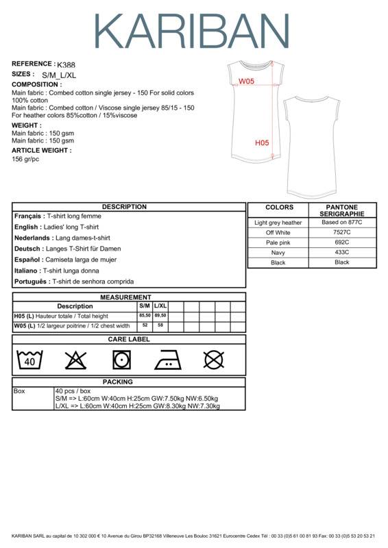 Feel comfy wearing this long ladies t-shirt.100% combed cotton jersey (Light Grey Heather : 90% cotton / 10% viscose). Comfort fit. Wide neck with neck tape and turn-up armhole finish. Curved hem with twin needle finishing. No brand label at neck, only size tag for easy relabelling. Certified STANDARD 100 by OEKO-TEX®N° CQ1007/7, IFTH.Comfort fitWide neck with neck tape and turn-up armhole finishCurved hem with twin-needle finishingNo brand label at neck, only size tag for easy relabellingBSCI certifiedOeko-Tex certified.Accreditations: Amfori BSCI|Oeko-TexAge Group: AdultFabric: 100% Combed cotton Jersey. Light Grey Heather: 85% Cotton, 15% ViscoseGender: FemalePlus Size: NoProduct Type: T-ShirtsSize Range: S/M to L/XLSizing To Fit: S/M 8/10 L/XL 12/14Tag: Sewn TagWashing Instructions: Machine wash 40°C. Do not bleach. Do not dry clean.Weight (GSM): 150gsm]]>