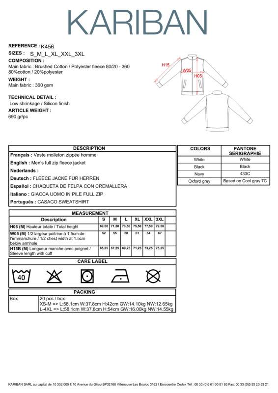 80% combed cotton/20% polyester. Low shrinkage brushed fleece. Silicone wash. Fitted style with ribbed side panels. Matching neck tape (except for White body where neck tape is Oxford Grey). Contrast striped ribbed inner collar (White for all colours, except for White body where stripes are Oxford Grey). 2 front pockets. Ribbed cuffs and hem. Zip fastening. Certified STANDARD 100 by OEKO-TEX® N° CQ 1007/8, IFTH.80% combed cotton / 20% polyesterLow shrinkage brushed fleeceSilicone washFitted style with ribbed side panelsmatching neck tape (except for White body where neck tape is Oxford Grey)Contrast striped ribbed inner collar2 front pocketsRibbed cuffs and hemZipBSCI certifiedOeko-Tex certifiedWRAP certified.Accreditations: Amfori BSCI|Oeko-Tex|WRAPAge Group: AdultFabric: 80% Cotton, 20% PolyesterGender: MalePlus Size: NoProduct Type: FleeceSize Range: S to 2XLSizing To Fit: S 36″ M 38″ L 40″ XL 42″ 2XL 44/46″Tag: Sewn TagWashing Instructions: 30 degree wash. Do not bleach. Cool iron. Do not dry clean. Tumble dry low.Weight (GSM): 360gsm]]>