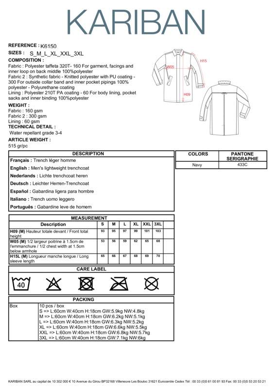 100% polyester. Water repellent 320T taffeta fabric. Shirt collar. Metal zip fastening concealed beneath studded placket. 2 decorative studded side pockets. Lining on the entire front and half-back only. 2 buttoned inner pockets and 1 mobile phone pocket. Outer collar stand and inner pockets in coated decorative fabric. Press-stud tab on cuffs. Invisible zip access for decoration.Metal zip fastening concealed beneath studded placketLining on the entire front and half-back only2 buttoned inner pockets and 1 mobile phone pocketOuter collar stand and inner pockets in coated decorative fabricInvisible zip access for decoration.Age Group: AdultFabric: 100% PolyesterGender: MalePlus Size: NoProduct Type: JacketsSize Range: S to 2XLSizing To Fit: S 36″ M 38″ L 40″ XL 42″ 2XL 44/46″Tag: Sewn TagWashing Instructions: Washable at 40°. Do not bleach. Do not iron. Drum drying prohibited. No solvent.Weight (GSM): 160gsm]]>