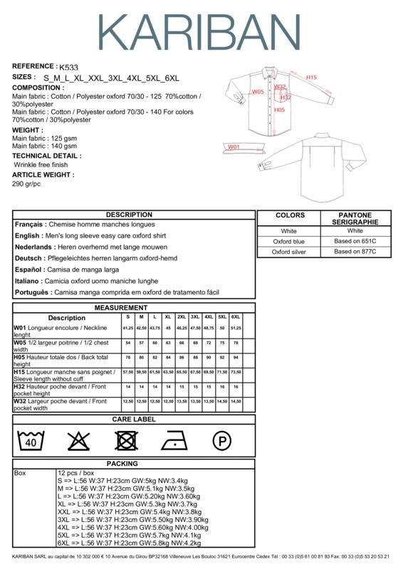70% Oxford cotton/30% polyester. Easy-care fabric. Button down collar. Matching buttons. V-shaped left chest pocket. Double back yoke with 2 side pleats. Adjustable rounded button cuffs with button placket. 2 spare buttons. Shaped hem. Certified STANDARD 100 by OEKO-TEX® N° CQ 1007/7, IFTH.70% Cotton Oxford / 30% PolyesterEasycare fabricButton down collarSelf coloured buttonsLeft chest pocketBack yoke with 2 side pleatsAdjustable cuff plus button on cuff gauntlet2 spare buttonsShaped hemBSCI certifiedOeko-Tex certifiedSEDEX certifiedWRAP certified.Accreditations: Amfori BSCI|Oeko-Tex|Sedex|WRAPAge Group: AdultFabric: 70% Cotton Oxford, 30% PolyesterGender: MalePlus Size: YesProduct Type: ShirtsSize Range: S to 6XLSizing To Fit: S 36″ M 38″ L 40″ XL 42″ 2XL 44/46″ 3XL 48/50″ 4XL 52/54″ 5XL 56/58″ 6XL 60″Tag: Sewn TagWashing Instructions: Iron at low heat - 110°C maximum. Wash at 40°C - Normal programme. Do not bleach. Do not dry clean. Tumble dry - Mild programme.Weight (GSM): White 130gsm, Colours 135gsm]]>