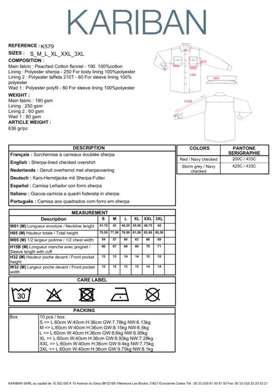100% cotton flannel. Sherpa-lined body in 100% polyester. Lined and padded sleeves in 100% polyester taffeta. Very soft and warm shirt jacket. 2 flap chest pockets. Classic button placket. Adjustable buttoned cuffs. Rounded hem. No brand label at neck, only size tag for easy relabelling. Certified STANDARD 100 by OEKO-TEX® N° CQ 1007/8, IFTH.Very soft and warm shirt jacket2 flap chest pocketsClassic button placketAdjustable buttoned cuffsRounded hemNo brand label at neck, only size tag for easy relabellingBSCI certifiedOeko-Tex certifiedSEDEX certified.Accreditations: Amfori BSCI|Oeko-Tex|SedexAge Group: AdultFabric: 100% Cotton flannel. Body lining: 100% Polyester. Sleeves: 100% Polyester taffeta.Gender: MalePlus Size: YesProduct Type: ShirtsSize Range: S to 3XLSizing To Fit: S 33/36″ M 36/38″ L 38/40″ XL 40/43″ 2XL 43/46″ 3XL 46/49″Tag: Sewn TagWashing Instructions: Machine wash 30°C. Do not bleach. Do not tumble dry. Do not dry clean.Weight (GSM): 190gsm]]>