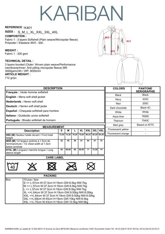 95% polyester/5% elastane. Softshell triple-layer bonded fabric. 3000 gsm/24h breathable and 8000 mm water-resistant. Breathable mid layer and micro fleece thermal inner layer. Zip through front. 2 zipped side pockets. 1 zipped left sleeve pocket.Softshell 3 layer bonded fabricBreathable up to 3000 gsm/24h & water resistant up to 8000 mm95% Polyester 5% Elastane outer layer, performance membrane mid layer & micro fleece thermal inner layerZip through front2 zip closing side pockets1 zip closing left sleeve pocketBSCI certifiedSEDEX certified.Accreditations: Amfori BSCI|SedexAge Group: AdultFabric: 95% Polyester, 5% Elastane. Breathable up to 3000mm and water-resistant up to 8000mmGender: MalePlus Size: NoProduct Type: SoftshellsSize Exclusions: *3XL only available in these coloursSize Range: S to 3XLSizing To Fit: S 36″ M 38″ L 40″ XL 42″ 2XL 44/46″ 3XL* 50/52″Tag: Sewn TagWashing Instructions: Do not iron. Wash at 30°C - Normal programme. Do not bleach. Do not tumble dry. Do not dry clean.Weight (GSM): 300gsm]]>