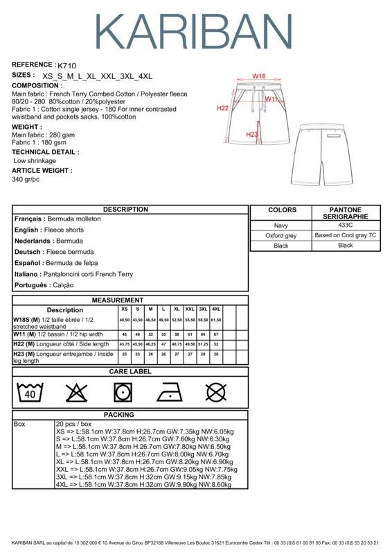 80% combed cotton/20% polyester. (Oxford Grey : 76% combed cotton / 21% polyester / 3% viscose). Low shrinkage French Terry. Large waistband with drawcord. 2 front pockets. 1 rear pocket with raw edges. Twin needle finishing at the hem. Certifié STANDARD 100 by OEKO-TEX®N° CQ1007/7, IFTH.80% Combed Cotton / 20% PolyesterLow shrinkage French TerryDeep waistband with drawcord2 front pockets with raw edges1 rear pocketTwin needle finishingBSCI certifiedOeko-Tex certified.Accreditations: Amfori BSCI|Oeko-TexAge Group: AdultFabric: 80% Combed cotton, 20% PolyesterGender: MalePlus Size: NoProduct Type: ShortsSize Range: S to 2XLSizing To Fit: S 30″ M 32″ L 34″ XL 36″ 2XL 38″Tag: Sewn TagWashing Instructions: Iron at low heat - 110°C maximum. Wash at 30°C - Normal programme. Do not bleach. Tumble dry - Mild programme.Weight (GSM): 280gsm]]>
