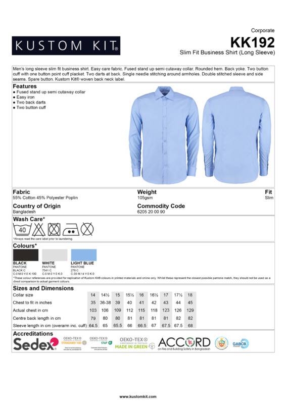 All the features of the popular business shirt but in a contemporary slim fit. Perfect for the style conscious customer.Easy care fabricFused stand-up semi cutaway collarRounded hemBack yokeTwo-button cuff with buttoned point cuff placketTwo darts at backSingle needle stitching around armholesDouble-stitched sleeve and side seamsSpare buttonKustom Kit® woven back neck labelSEDEX certifiedOeko-Tex certified.Accreditations: Oeko-Tex|SedexAge Group: AdultFabric: 55% Cotton, 45% PolyesterGender: MalePlus Size: NoProduct Type: ShirtsSize Range: 14″ to 18″Sizing To Fit: 14″ 14.5″ 15″ 15.5″ 16″ 16.5″ 17″ 17.5″ 18″Tag: Sewn TagWashing Instructions: Machine wash 40 with bar under, do not bleach, do not dry clean, do not tumble dry, two dot ironWeight (GSM): 105gsm]]>
