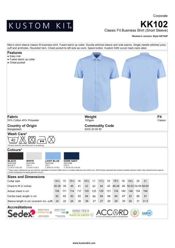 The men’s short sleeve business shirt is ideal for a range of corporate environments. Produced with durable cotton rich poplin and enhanced with an easy-iron finish.Fused stand-up collarDouble-stitched sleeve and side seamsSingle needle stitched yoke, cuffs and armholesRounded hemChest pocket to left side as wornSpare buttonKustom Kit® woven back neck labelSEDEX certifiedOeko-Tex certified.Accreditations: Oeko-Tex|SedexAge Group: AdultFabric: 55% Cotton, 45% PolyesterGender: MalePlus Size: YesProduct Type: ShirtsSize Range: 14.5″ to 21″Sizing To Fit: 14.5″ 15″ 15.5″ 16″ 16.5″ 17″ 17.5″ 18″ 18.5″ 19″ 19.5″ 20″ 21″Tag: Sewn TagWashing Instructions: Machine wash 40 with bar under, do not bleach, do not dry clean, do not tumble dry, two dot ironWeight (GSM): 105gsm]]>