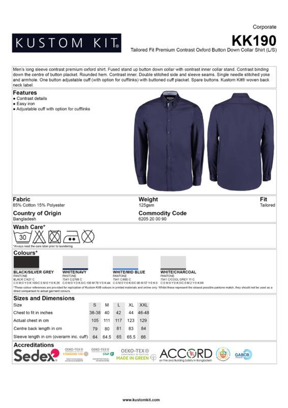 A fashion led premium Oxford shirt with complementary contrast to the inner collar stand, inner cuff and cuff placket.Fused stand-up button-down collar with contrast inner collar standContrast binding down the centre of button placketRounded hemDouble-stitched side and sleeve seamsSingle-stitched yoke and armholesOne-button adjustable cuff (with option for cufflinks) with buttoned cuff placketSpare buttonsKustom Kit® woven back neck labelSEDEX certifiedOeko-Tex certified.Accreditations: Oeko-Tex|SedexAge Group: AdultFabric: 85% Cotton, 15% PolyesterGender: MalePlus Size: NoProduct Type: ShirtsSize Range: S to 2XLSizing To Fit: S 36/38″ M 40″ L 42″ XL 44″ 2XL 46/48″Tag: Sewn TagWashing Instructions: Machine wash 30 with bar under, do not bleach, do not dry clean, do not tumble dry, two dot ironWeight (GSM): 125gsm]]>