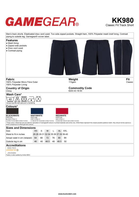 A practical pair of shorts that are suitable for all sporting occasions. The peached finish provides a soft and comfortable feel to the fabric.Elasticated drawcord waistTwo side zipped pocketsStraight hemContrast piping down outside legSide ventsPolyester mesh brief liningGamegear® woven labelOeko-Tex certifiedBSCI certified.Accreditations: Amfori BSCI|Oeko-TexAge Group: AdultFabric: 100% Polyester microfibre with peach finish. Lining: 100% Polyester mesh liningGender: MalePlus Size: NoProduct Type: ShortsSize Range: XS to 2XLSizing To Fit: XS 26/28″ S 29/31″ M 32/34″ L 35/36″ XL 37/38″ 2XL 39/40″Tag: Sewn TagWashing Instructions: Machine wash 40 with bar under, do not bleach, do not dry clean, do not tumble dry, one dot ironWeight (GSM): 115gsm]]>