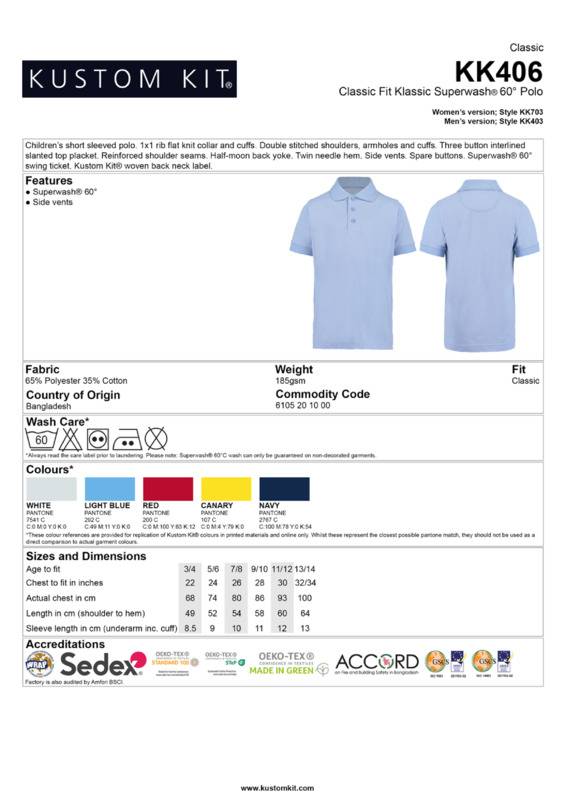 The popular Klassic polo is available in a range of kids sizes, allowing the collection to be suitable for everyone.1x1 rib flat knit collar and cuffsDouble-stitched shoulders, armholes and cuffsThree-button interlined slanted top placketReinforced shoulder seamsHalf moon back yokeSide ventsSpare buttonsSuperwash® 60° swing ticketKustom Kit® woven back neck labelWRAP certifiedSEDEX certifiedOeko-Tex certifiedBSCI certified.Accreditations: Amfori BSCI|Oeko-Tex|Sedex|WRAPAge Group: KidsFabric: 65% Polyester, 35% CottonGender: UnisexPlus Size: NoProduct Type: PolosSize Exclusions: * Size 13/14 is VATableSize Range: 3/4 to 13/14Sizing To Fit: 3/4 22″ 5/6 24″ 7/8 26″ 9/10 28″ 11/12 30″ 13/14 32/34″Tag: Sewn TagWashing Instructions: Machine wash 60 with bar under, do not bleach, do not dry clean, two dot tumble dry, two dot ironWeight (GSM): 180gsm]]>