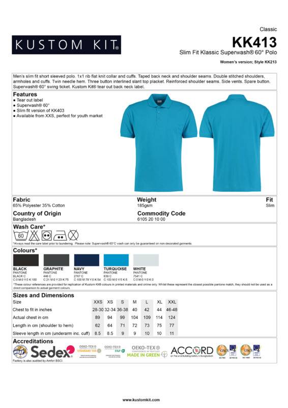 A modern slim fit version of the traditional and extremely popular Klassic polo.1x1 rib flat knit collar and cuffsTaped back neck and shoulder seamsDouble-stitched shoulders, armholes and cuffsTwin-needle hemThree button interlined slanted top placketReinforced shoulder seamsSide ventsSpare buttonSuperwash® 60° swing ticketKustom Kit® tear out labelWRAP certifiedSEDEX certifiedOeko-Tex certifiedBSCI certified.Accreditations: Amfori BSCI|Oeko-Tex|Sedex|WRAPAge Group: AdultFabric: 65% Polyester, 35% CottonGender: MalePlus Size: NoProduct Type: PolosSize Range: XXS to 2XLSizing To Fit: XXS 28/30″ XS 32/34″ S 36/38″ M 40″ L 42″ XL 44″ 2XL 46/48″Tag: Tear-outWashing Instructions: Machine wash 60 with bar under, do not bleach, do not dry clean, two dot tumble dry, two dot ironWeight (GSM): 185gsm]]>