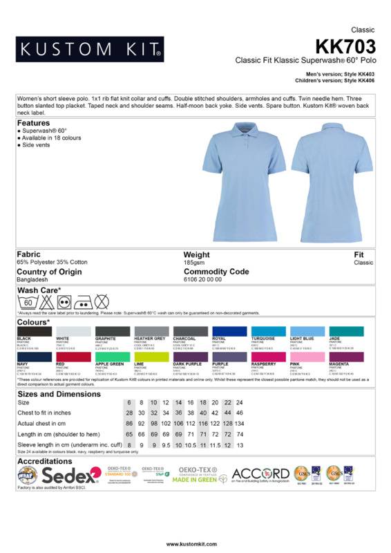 The original Kustom Kit® polo that is renowned for it’s superior quality, easycare properties and vast colour range.1x1 rib flat knit collar and cuffsDouble stitched shoulders, armholes and cuffsThree button interlined slanted top placketReinforced shoulder seamsHalf moon back yokeSide ventsSpare buttonSuperwash® 60° swing ticketKustom Kit® woven back neck labelWRAP certifiedSEDEX certifiedOeko-Tex certifiedBSCI certified.Accreditations: Amfori BSCI|Oeko-Tex|Sedex|WRAPAge Group: AdultFabric: 65% Polyester, 35% CottonGender: FemalePlus Size: YesProduct Type: PolosSize Exclusions: *24 only available in these coloursSize Range: 6 to 22Sizing To Fit: 6 28“ 8 30“ 10 32“ 12 34“ 14 36“ 16 38“ 18 40“ 20 42“ 22 44“ 24* 46“Tag: Sewn TagWashing Instructions: Machine wash 60 with bar under, do not bleach, do not dry clean, two dot tumble dry, two dot ironWeight (GSM): 185gsm]]>