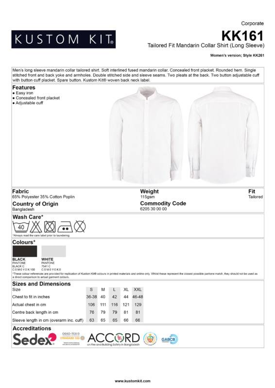 This men’s long sleeve shirt has a mandarin collar and concealed placket. Making it ideal for a vast range of businesses.Soft interlined fused mandarin collarConcealed front placketRounded hemSingle-stitched front and back yoke and armholesDouble-stitched side and sleeve seamsTwo pleats at the back1-button adjustable cuff with button cuff placketSpare buttonsKustom Kit® woven back neck labelSEDEX certifiedOeko-Tex certified.Accreditations: Oeko-Tex|SedexAge Group: AdultFabric: 65% Polyester, 35% Cotton poplinGender: MalePlus Size: NoProduct Type: ShirtsSize Range: S to 2XLSizing To Fit: S 36/38″ M 40″ L 42″ XL 44″ 2XL 46/48″Tag: Sewn TagWashing Instructions: Machine wash 40 with bar under, do not bleach, do not dry clean, do not tumble dry, two dot ironWeight (GSM): 115gsm]]>