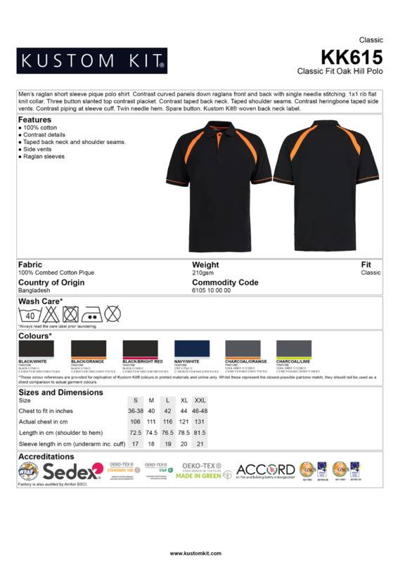 An active and sporty looking polo in 100% cotton that will suit a variety of locations and purposes.Contrast curved panels down raglans front and back with single needle stitching1x1 rib flat knit collar3-button slanted top placketInner contrast placketTaped shoulder seamsContrast herringbone taped side ventsContrast piping at sleeve cuffTwin-needle hemSpare buttonKustom Kit® woven back neck labelWRAP certifiedSEDEX certifiedOeko-Tex certifiedBSCI certified.Accreditations: Amfori BSCI|Oeko-Tex|Sedex|WRAPAge Group: AdultFabric: 100% CottonGender: MalePlus Size: NoProduct Type: PolosSize Range: S to 2XLSizing To Fit: S 36/38″ M 40″ L 42″ XL 44″ 2XL 46/48″Tag: Sewn TagWashing Instructions: Machine wash 40 with no bar under, do not bleach, do not dry clean, do not tumble dry, two dot ironWeight (GSM): 210gsm]]>