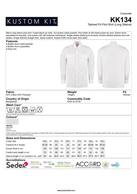 The versatile design features of the pilot shirt make this the perfect shirt for the whole transport industry as well as the police and security professionals. Cotton rich, easy-iron and styled in a tailored fit, it will look smart and stay looking smart.Fused stand-up collarEasy ironDoubled-stitched side and sleeve seamsSingle button cuff with one button placketTwo chest pockets with button down flapsPen holder left side pocket as wornButton down epaulettes to shouldersSingle needle stitched yoke and armholeSingle-stitched straight hem and cuffsSpare buttonKustom Kit® woven back neck labelSEDEX certifiedOeko-Tex certified.Accreditations: Oeko-Tex|SedexAge Group: AdultFabric: 55% Mercerised cotton, 45% Polyester poplinGender: MalePlus Size: NoProduct Type: ShirtsSize Range: 14.5″ to 19.5″Sizing To Fit: 14.5″ 15″ 15.5″ 16″ 16.5″ 17″ 17.5″ 18″ 18.5″, 19″, 19.5″Tag: Sewn TagWashing Instructions: Machine wash 40 with bar under, do not bleach, do not dry clean, do not tumble dry, two dot ironWeight (GSM): 105gsm]]>