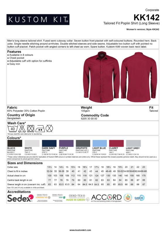 Men's long sleeve tailored poplin shirt. Versatile business shirt with modern cutaway collar, adjustable cuff and chest pocket.Fused semi cutaway collar7-button placket with self-coloured buttonsRounded hemback yokeSingle stitching around armholesDouble-stitched sleeves and side seamsAdjustable 1-button cuff with pointed no button cuff placketPatch pocket with angled corners to left chest as wornSpare buttonKustom Kit® woven back neck labelSEDEX certifiedOeko-Tex certified.Accreditations: Oeko-Tex|SedexAge Group: AdultFabric: 65% Polyester, 35% Cotton poplinGender: MalePlus Size: YesProduct Type: ShirtsSize Exclusions: *13.5″ and 14″ only available in these coloursSize Range: 13.5 to 23″Sizing To Fit: 13.5″* 14″* 14.5″ 15″ 15.5″ 16″ 16.5″ 17″ 17.5″ 18″ 18.5″ 19″ 19.5″ 20″ 21″ 22″ 23″Tag: Sewn TagWashing Instructions: Machine wash 40°. Do not bleach. Warm iron. Do not tumble dry. Do not dry clean. Wash as synthetics, wash dark colours together, reshape whilst damp.Weight (GSM): 105gsm]]>