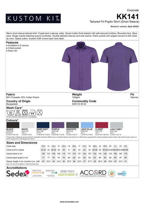 Men's short sleeve tailored poplin shirt. Versatile business shirt with modern cutaway collar and chest pocket.Fused semi cutaway collar7-button placket with self-coloured buttonsRounded hemback yokeSingle stitching around armholesDouble-stitched sleeves and side seamsPatch pocket with angled corners to left chest as wornSpare buttonKustom Kit® woven back neck labelSEDEX certifiedOeko-Tex certified.Accreditations: Oeko-Tex|SedexAge Group: AdultFabric: 65% Polyester, 35% Cotton poplinGender: MalePlus Size: YesProduct Type: ShirtsSize Exclusions: *13.5″ and 14″ only available in these coloursSize Range: 13.5 to 23″Sizing To Fit: 13.5″* 14″* 14.5″ 15″ 15.5″ 16″ 16.5″ 17″ 17.5″ 18″ 18.5″ 19″ 19.5″ 20″ 21″ 22″ 23″Tag: Sewn TagWashing Instructions: Machine wash 40°. Do not bleach. Warm iron. Do not tumble dry. Do not dry clean. Wash as synthetics, wash dark colours together, reshape whilst damp.Weight (GSM): 105gsm]]>