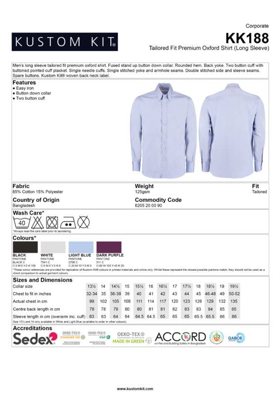 This long sleeve shirt fulfils all expectations of a premium Oxford. It’s high quality cotton rich fabric is highly durable and suitable for all corporate environments.Fused stand-up button-down collarRounded hemBack yokeTwo button cuff with one button pointed cuff placketSingle-stitched cuffsSingle-stitched yoke and armhole seamsDouble-stitched side and sleeve seamsSpare buttonsKustom Kit® woven back neck labelSEDEX certifiedOeko-Tex certified.Accreditations: Oeko-Tex|SedexAge Group: AdultFabric: 85% Cotton, 15% PolyesterGender: MalePlus Size: NoProduct Type: ShirtsSize Exclusions: *13.5 and 14 only available in these coloursSize Range: 13.5″ to 19.5″Sizing To Fit: 13.5″* 14″* 14.5″ 15″ 15.5″ 16″ 16.5″ 17″ 17.5″ 18″ 18.5″ 19″ 19.5″Tag: Sewn TagWashing Instructions: Machine wash 40 with bar under, do not bleach, do not dry clean, do not tumble dry, two dot ironWeight (GSM): 125gsm]]>