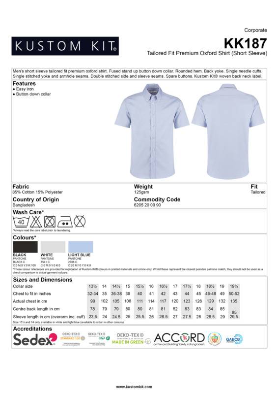 This short sleeve shirt fulfils all expectations of a premium Oxford. It’s high quality cotton rich fabric is highly durable and suitable for all corporate environments.Fused stand-up button-down collarRounded hemBack yokeSingle-stitched cuffsSingle-stitched yoke and armhole seamsDouble-stitched side and sleeve seamsSpare buttonsKustom Kit® woven back neck labelSEDEX certifiedOeko-Tex certified.Accreditations: Oeko-Tex|SedexAge Group: AdultFabric: 85% Cotton, 15% PolyesterGender: MalePlus Size: NoProduct Type: ShirtsSize Exclusions: *13.5″ and 14″ are only available in these coloursSize Range: 13.5″ to 19.5″Sizing To Fit: 13.5″* 14″* 14.5″ 15″ 15.5″ 16″ 16.5″ 17″ 17.5″ 18″ 18.5″ 19″ 19.5″Tag: Sewn TagWashing Instructions: Machine wash 40 with bar under, do not bleach, do not dry clean, do not tumble dry, two dot ironWeight (GSM): 125gsm]]>