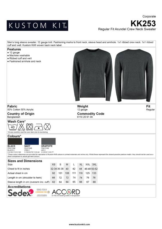 Made from a soft cotton/acrylic blend, this sweater is both comfortable and durable. Ribbed neck, cuff and welt to ensure shape retention. The crew neck styling can be worn with or without a shirt. Fashioning marks add a touch of quality.12 gauge knitFashioning marks to front neck, sleeve head and armhole1x1 ribbed crew neck, cuff and weltKustom Kit® woven back neck labelSEDEX certified.Accreditations: Oeko-Tex|SedexAge Group: AdultFabric: 50% Cotton, 50% AcrylicGender: MalePlus Size: YesProduct Type: Knitted JumpersSize Range: XS to 3XLSizing To Fit: XS 32/34″ S 36/38″ M 40″ L 42″ XL 44″ 2XL 46/48″ 3XL 50/52″Tag: Sewn TagWashing Instructions: Wash as synthetics 40°. Do not bleach. One dot iron. Do not tumble dry. Do not dry clean.Weight (GSM): 12 gauge]]>