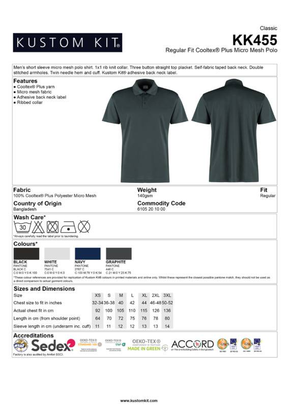 Manufactured from innovative Cooltex® plus yarn which has integral wicking properties, this micro mesh polo will keep you cool and comfortable no matter the activity. The garment benefits from a smart 1x1 ribbed collar and double stitched details.1x1 rib knit collarThree button straight top placketSelf-fabric taped back neckDouble stitched armholeTwin-needle hem and cuffKustom Kit® adhesive back neck labelWRAP certifiedSEDEX certified.Accreditations: Amfori BSCI|Oeko-Tex|Sedex|WRAPAge Group: AdultFabric: 100% Cooltex® plus polyester micro meshGender: MalePlus Size: YesProduct Type: PolosSize Range: XS to 3XLSizing To Fit: XS 32/34″ S 36/38″ M 40″ L 42″ XL 44″ 2XL 46/48″ 3XL 50/52″Tag: AdhesivesWashing Instructions: Wash as synthetics 30°. Do not bleach. One dot iron. Do not tumble dry. Do not dry clean.Weight (GSM): 140gsm]]>