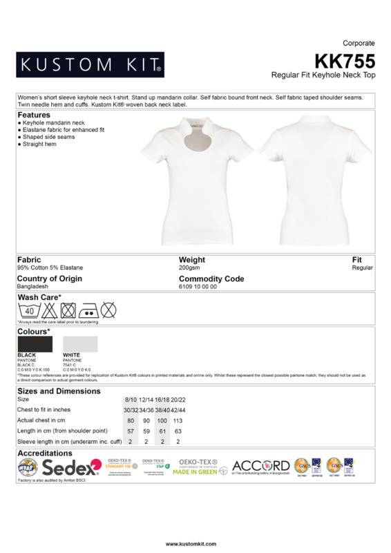 The stretch fabric in this keyhole neck top ensures a perfect fit. Made in a heavy weight cotton jersey it is smart durable and cool to wear, suitable for any business environment.Stand-up mandarin collarSelf fabric bound front neckSelf fabric taped shoulder seamsTwin-needle hem and cuffsKustom Kit® woven back neck labelWRAP certifiedSEDEX certifiedOeko-Tex certifiedBSCI certified.Accreditations: Amfori BSCI|Oeko-Tex|Sedex|WRAPAge Group: AdultFabric: 95% Cotton, 5% ElastaneGender: FemalePlus Size: YesProduct Type: T-ShirtsSize Range: 8/10 to 20/22Sizing To Fit: 8/10 30/32“ 12/14 34/36“ 16/18 38/40“ 20/22 42/44“Tag: Sewn TagWashing Instructions: Machine wash 40 with bar under, do not bleach, do not dry clean, do not tumble dry, two dot ironWeight (GSM): 200gsm]]>
