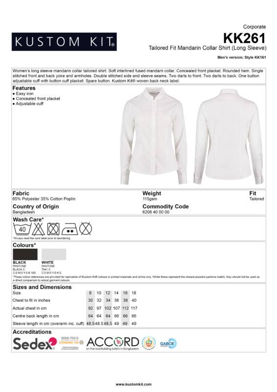 This women's long sleeved shirt has a mandarin collar and concealed placket. Making it ideal for a vast range of businesses.Soft fused mandarin collarEasy ironConcealed placketRounded hemSingle-stitched front and back yoke and armholesDouble-stitched side and sleeve seamsTwo darts to frontTwo darts to back1-button adjustable cuff with button cuff placketSpare buttonKustom Kit® woven back neck labelSEDEX certifiedOeko-Tex certified.Accreditations: Oeko-Tex|SedexAge Group: AdultFabric: 65% Polyester, 35% Cotton poplinGender: FemalePlus Size: NoProduct Type: ShirtsSize Range: 8 to 18Sizing To Fit: 8 30“ 10 32“ 12 34“ 14 36“ 16 38“ 18 40“Tag: Sewn TagWashing Instructions: Machine wash 40 with bar under, do not bleach, do not dry clean, do not tumble dry, two dot ironWeight (GSM): 115gsm]]>