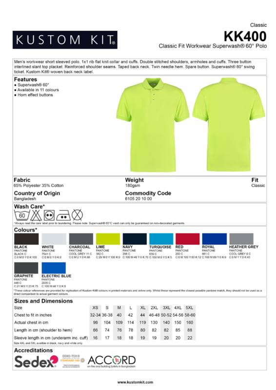 This hardwearing total easycare polo has been designed for workwear. In addition, it benefits from an extensive colour range.1x1 rib flat knit collar and cuffsDouble-stitched shoulders, armholes and cuffsThree-button interlined slanted top placketReinforced shoulder seamsTaped back neckSpare buttonsSuperwash® 60° swing ticketKustom Kit® woven back neck labelSEDEX certifiedOeko-Tex certified.Accreditations: Oeko-Tex|SedexAge Group: AdultFabric: 65% Polyester, 35% Cotton piquéGender: MalePlus Size: YesProduct Type: PolosSize Exclusions: *4XL and 5XL only available in these coloursSize Range: XS to 5XLSizing To Fit: XS 32/34″ S 36/38″ M 40″ L 42″ XL 44″ 2XL 46/48″ 3XL 50/52″ 4XL* 54/56″ 5XL* 58/60″Tag: Sewn TagWashing Instructions: Machine wash 60 with bar under, do not bleach, do not dry clean, two dot tumble dry, two dot ironWeight (GSM): 180gsm]]>