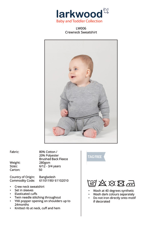 The ultimate in layering product the crew neck sweatshirt with YKK popper opening on shoulder to ensure the comfort and safety of the child. This style is available in a selection of bright colours. Please note: some sizes have poppers and some don't.Crew neck sweatshirtKnitted rib at neck, cuff and hemYKK popper opening on shoulderTwin needle stitchingSEDEX certifiedOeko-Tex certifiedBSCI certified.Accreditations: Amfori BSCI|Oeko-Tex|SedexAge Group: InfantFabric: 80% Cotton, 20% Polyester, brushed-back fleeceGender: UnisexPlus Size: NoProduct Type: SweatshirtsSize Range: 6/12mths to 3/4yrsSizing To Fit: 6/12mths 68/80cm 12/18mths 80/86cm 18/24mths 86/92cm 24/36mths 92/98cm 3/4yrs 98/104cmTag: Sewn TagWashing Instructions: Machine or hand wash separately, lay flat to dry. Wash at 40 degrees. Wash dark colours separately. Do not iron directly onto motif if decorated.Weight (GSM): 280gsm]]>