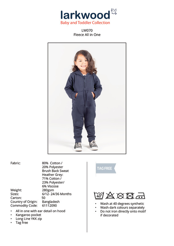 The cosy fleece all-in-one has cute ear hood details, a kangaroo pocket and YKK zip feature. The product is tag-free allowing freedom for decoration and embellishment, with bright colours available.Long line zip for ease of accessHood with ears detailSingle Jersey inner hoodFront kangaroo pocketFlat lock stitchingBSCI certified.Accreditations: Amfori BSCIAge Group: InfantFabric: 80% Cotton, 20% Polyester brush-back fleeceGender: UnisexPlus Size: NoProduct Type: OnesiesSize Range: 6/12mths to 24/36mthsSizing To Fit: 6/12mths 68/80cm 12/18mths 80/86cm 18/24mths 86/92cm 24/36mths 92/98cmTag: Sewn TagWashing Instructions: Do Not Bleach, Do Not Tumble Dry, 2 Dot Iron, Do not Dry Clean, Wash at 40 degrees synthetic, Wash Dark Colours Separately, Don’t Iron directly onto motif If decoratedWeight (GSM): 280gsm]]>