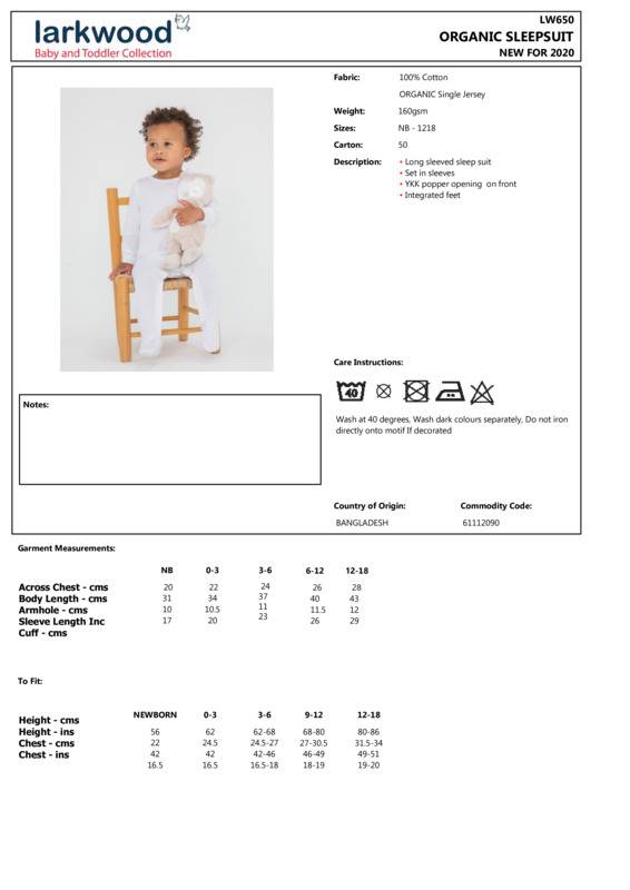 Making a change, this super-soft organic cotton sleepsuit has hidden YKK poppers in the inseam and on shoulder as well as soft set-in feet.Long-sleeved sleepsuit made in organic cottonYKK popper fastening on shoulder and around leg openingSet-in feetBinding around neck and self-fabric cuff on the sleeveBSCI certifiedSEDEX certified.Accreditations: Amfori BSCI|Oeko-Tex|SedexAge Group: InfantFabric: 100% Organic cotton, single JerseyGender: UnisexPlus Size: NoProduct Type: SleepsuitsSize Range: Newborn to 12/18Sizing To Fit: Newborn 22″ 0/3mths 25″ 3/6mths 25/27″ 6/12mths 27/31″ 12/18mths 32/34″Tag: Sewn TagWashing Instructions: 40 degrees Cotton wash. Do Not Bleach. Do Not Tumble Dry. 2 Dot Iron. Do not Dry Clean. Wash Dark Colours Separately. Don’t Iron directly onto motif If decorated.Weight (GSM): 160gsm]]>
