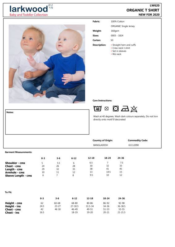 Making a change, this super-soft organic cotton t-shirt comes with a ribbed neckline and twin-needle stitching throughout and is available in lots of key colours.Crew neck short sleeved t-shirt made in organic cottonRibbed necklineTwin-needle stitching at neck, hem and sleevesBSCI certifiedSEDEX certified.Accreditations: Amfori BSCI|Oeko-Tex|SedexAge Group: InfantFabric: 100% Organic cotton, single JerseyGender: UnisexPlus Size: NoProduct Type: T-ShirtsSize Range: 0/3 to 24/36Sizing To Fit: 0/3mths 17″ 3/6mths 17/18″ 6/12mths 18/19″ 12/18mths 19/20″ 18/24mths 20/21″ 24/36mths 21/22″Tag: Sewn TagWashing Instructions: 40 degrees Cotton wash. Do Not Bleach. Do Not Tumble Dry. 2 Dot Iron. Do not Dry Clean. Wash Dark Colours Separately. Don’t Iron directly onto motif If decorated.Weight (GSM): 160gsm]]>