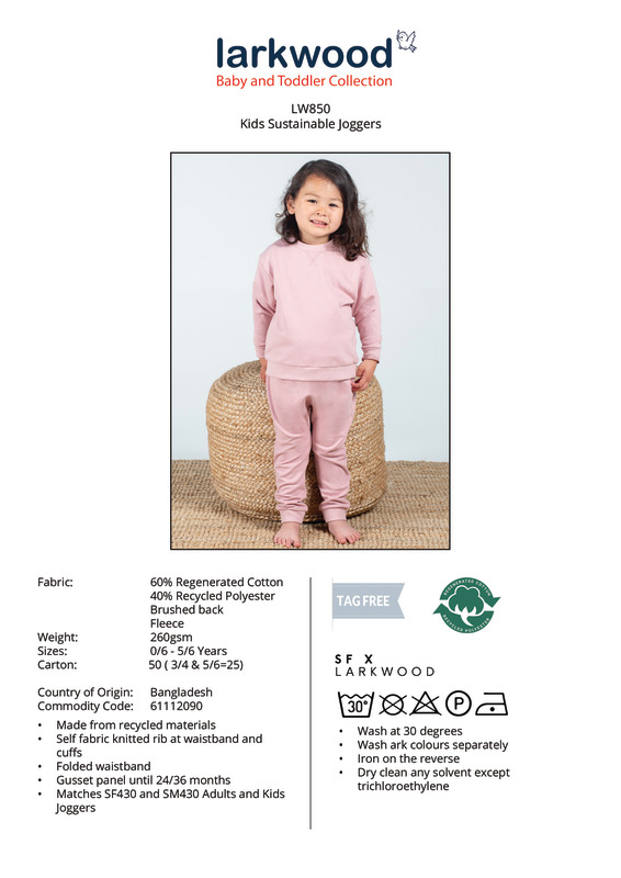 Consciously cool, the sustainable joggers are a fashion favourite with super-soft brushed back fleece on the inside for a cosy feeling. Match up with the new Sustainable sweatshirt for the coolest outfit in the playground.Kids joggers made in sustainable fabric with self-fabric knitted rib at folded waistband and cuffsGusset panelTag-freeSEDEX certifiedBSCI certifiedOeko-Tex certified.Accreditations: Oeko-Tex|Amfori BSCI|SedexAge Group: InfantFabric: 100% Cotton denim, stone washed, 60% Regenerated cotton, 40% Recycled polyester, brushed back fleeceGender: UnisexPlus Size: NoProduct Type: SweatpantsSize Range: 0/6mths to 5/6yrsSizing To Fit: 0/6mths 19cm 6/12mths 21cm 12/18mths 23cm 18/24mths 25cm 24/36mths 27cm 3/4yrs 29cm 5/6yrs 31cmTag: TaglessWashing Instructions: Wash at 30° synthetic. Do not bleach. Do not tumble dry. Iron on low. Dry clean with any solvent except Trichloroethylene. Iron on reverse. Wash dark colours separately.Weight (GSM): 260gsm]]>