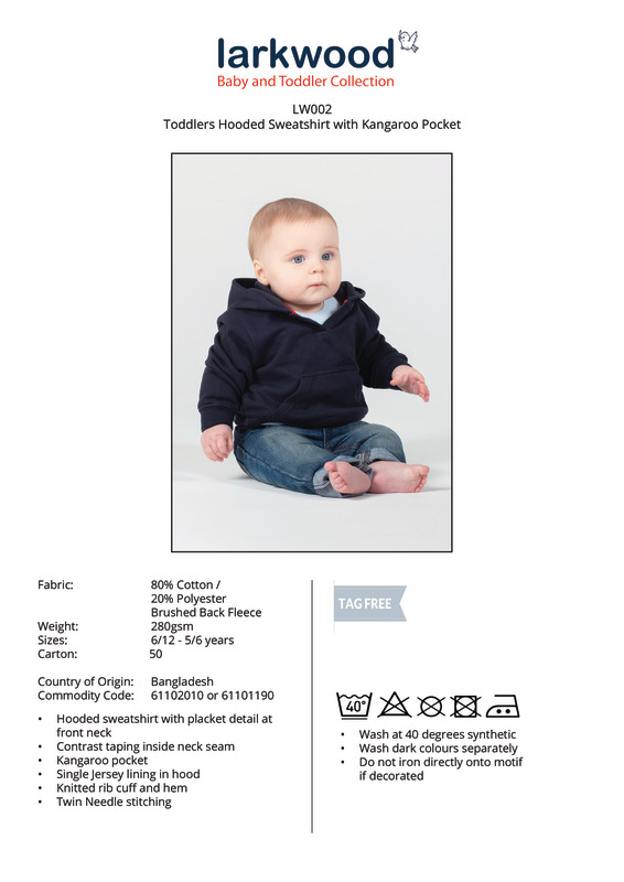 The cosy hooded sweatshirt with kangaroo pocket is available in a wide choice of colours providing able opportunity for sublimation printing and embroidery.Hooded sweatshirt with placket detail at front neckContrast taping inside neck seamSingle jersey in hoodKangaroo pocketKnitted rib at cuff and hemTwin needle stitchingSEDEX certifiedOeko-Tex certifiedBSCI certified.Accreditations: Amfori BSCI|Oeko-Tex|SedexAge Group: InfantFabric: 80% Cotton, 20% Polyester, brush-back fleeceGender: UnisexPlus Size: NoProduct Type: HoodiesSize Exclusions: *5/6yrs only available in these coloursSize Range: 6/12mths to 5/6yrsSizing To Fit: 6/12mths 68/80cm 12/18mths 80/86cm 18/24mths 86/92cm 24/36mths 92/98cm 3/4yrs 98/104cm 5/6yrs* 110/116cmTag: Sewn TagWashing Instructions: Do not bleach. Do not tumble dry. 2 dot iron. Do not dry clean. Wash at 40 degrees synthetic. Wash dark colours separately. Don’t iron directly onto motif if decoratedWeight (GSM): 280gsm]]>