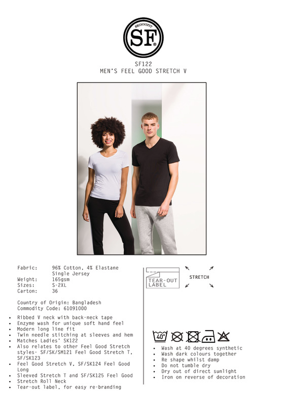 Wear it your way. A modern v-neck style from the iconic feel good stretch range. Enzyme washed for a smooth decorating surface and unique soft-hand feel. Ribbed crew neck and back neck tape ensure a premium finish. The tear-out label means it’s super easy to rebrand.Feel good men's stretch t-shirt with enzyme wash for unique soft hand-feel96% cotton, 4% elastane for improved fit, comfort and shape retentionModern long-line fitV-neck with back neck binding and soft stretchy rib necklineFeatures tearable removable labelSEDEX certifiedBSCI certifiedOeko-Tex certifiedVegan certified.Accreditations: Amfori BSCI|Oeko-Tex|Sedex|Peta Approved VeganAge Group: AdultFabric: 96% Cotton, 4% Elastane. Heather Grey: 81% Cotton, 15% Viscose, 4% Elastane single JerseyGender: MalePlus Size: NoProduct Type: T-ShirtsSize Range: S to 2XLSizing To Fit: S 36/38″ M 38/40″ L 42″ XL 44/46″ 2XL 48″Tag: Tear-outWashing Instructions: Wash at 40 degrees synthetic. Wash dark colours together. Do not dry clean. Do not bleach. 2 dot iron. Reshape whilst damp. Dry out of direct sunlight. Do not tumble dry. Iron on reverse of decoration.Weight (GSM): 165gsm]]>