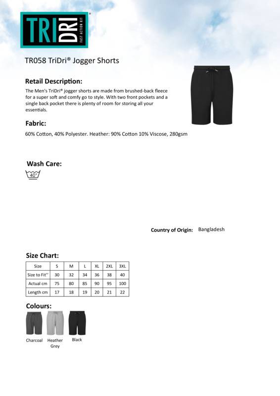 The men’s TriDri® jogger shorts are made from brushed-back fleece for a super-soft and comfy go-to style. With two front pockets and a single back pocket, there is plenty of room for storing all your essentials.Silver eyelets and drawcord endsTwo front pocketsSelf-fabric tiesElasticated waistbandSingle back pocket detailingBrushed-back fleece innerWe recommend using block out vinyl and inks.Product contains no branded neck or waist labelRemovable Kimble or looped garment tagsInner seam label holds important product information on one label with a second label containing brand information which can be cut-away.Accreditations: SEDEX|WRAP|Amfori BSCI|RCS Blended (Licence)Age Group: AdultFabric: 60% Cotton, 40% Recycled Polyester. Heather Grey: 90% Cotton, 10% ViscoseGender: MalePlus Size: YesProduct Type: ShortsSize Range: S to 3XLSizing To Fit: S 30'' M 32'' L 34'' XL 36'' 2XL 38'' 3XL 40″Tag: Cut-away inner labelWashing Instructions: 40 degree domestic washWeight (GSM): 280gsm]]>
