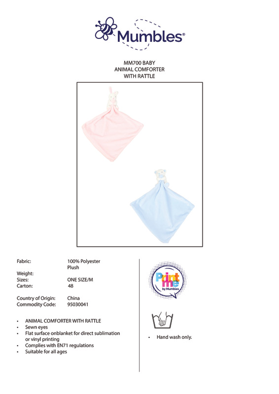 This lovely soft plush rabbit comforter is a perfect gift for any newborn baby or small child. It has a double layered blanket with access for decoration and an internal rattle. It is available in Blue Bear and Pink Rabbit colour options. Complies with EN71 European Toy Safety regulations. Remove all hang tags and their fasteners before giving these items to a child. Suitable for all ages.Soft plush rabbit comforter with double layered blanket and internal rattleAvailable in baby pink and baby blue colour optionsZip access allows the blanket to be directly embroidered, vinyl or sublimation printedComplies with EN71 European Toy Safety regulationsRemove all hang tags and their fasteners before giving these items to a childSuitable for all agesSEDEX certified.Accreditations: Amfori BSCI|SedexAge Group: InfantFabric: 100% Polyester plushGender: UnisexPlus Size: NoProduct Type: BlanketsSize Range: OnesizesSizing To Fit: One size (33 x 33cm)Tag: Sewn TagWashing Instructions: Hand wash]]>