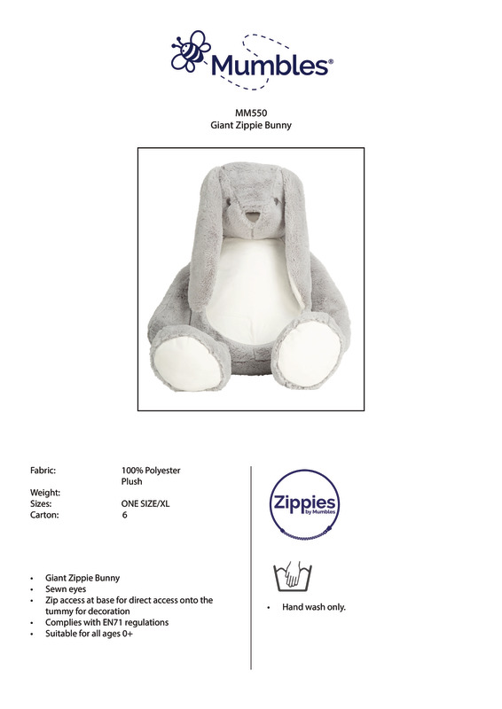 This giant Zippie bunny is a giant amongst bunnies. It can be printed or embroidered directly onto the tummy and is made in lovely soft fur. It also matches to smaller Zippie grey bunny and Printme mini.Giant Zippie bunny has a zip around the bottom to allow direct access for decorationRemoveable inner stuffingSewn eyes, nose and mouthContrast white tummy, feet and inside floppy earsSuitable for all agesComplies with EN71 regulationsSEDEX certifiedBSCI certified.Accreditations: Amfori BSCI|SedexAge Group: KidsFabric: 100% PolyesterGender: UnisexPlus Size: NoPrint Area: 31cm x 25cmProduct Type: Soft ToysSize Range: OnesizeSizing To Fit: One sizeTag: TaglessWashing Instructions: Hand wash onlyWeight (GSM): 960gsm]]>