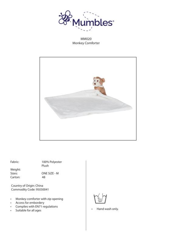 Soft, plush Monkey comforter with double-layered blanket with zip access for decoration and embellishment.Baby monkey comforter with double fabric blanketZip access for embroideryMonkey with soft filling33 x 33 cm blanketComplies with EN71 European Toy Safety regulationsRemove all hang tags and their fasteners before giving these items to a childSuitable for children of all agesBSCI certifiedSEDEX certified.Accreditations: Amfori BSCI|SedexAge Group: Infant|KidsFabric: 100% Polyester plushGender: UnisexPlus Size: NoPrint Area: 33 x 33cmProduct Type: Soft ToysSize Range: MSizing To Fit: M (33 x 33cm)Tag: TaglessWashing Instructions: Hand wash]]>