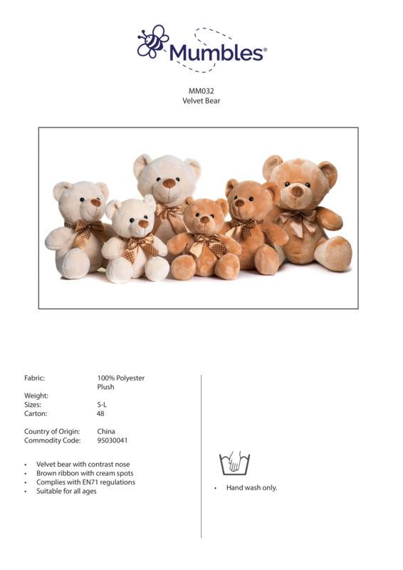 The Velvet bears are dressed to impress! Accessorised with their brown and cream spotted ribbon.Velvet Bears with contrast noseBrown ribbon with cream spotsSuitable for clothing in size Small, Medium and LargeComplies with EN71 European Toy Safety regulationsRemove all hang tags and their fasteners before giving these items to a childNot suitable for children under the age of 36 monthsBSCI certifiedSEDEX certified.Accreditations: Amfori BSCI|SedexAge Group: Infant|KidsFabric: 100% Polyester plushGender: UnisexPlus Size: NoProduct Type: Soft ToysSize Range: S to LSizing To Fit: S (20cm) M (30cm) L (40cm)Tag: TaglessWashing Instructions: Hand wash only]]>