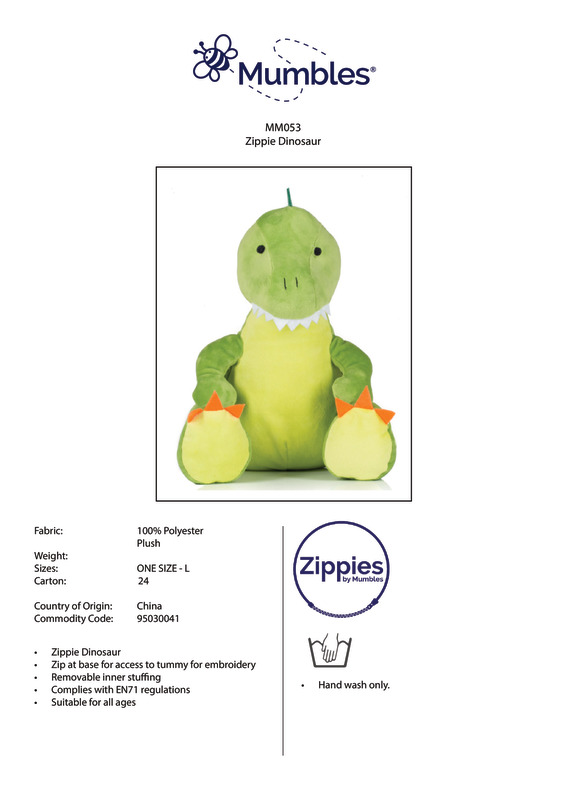 Take a trip back in time with the Zippie dinosaur with its soft plush fabric and bright green body with felt feet, teeth and spikes. The tummy is easily decorated with zip access, allowing for embroidery and sublimation printing.Green coloured DinosaurContrast Felt decorationSewn eyesLight green panel on chest and feetZip details on base of dinosaur for direct access onto the tummy for embroideryRemovable inner stuffingComplies with EN71 European Toy Safety regulationsRemove all hang tags and their fasteners before giving these items to a childSuitable for children of all agesBSCI certifiedSEDEX certified.Accreditations: Amfori BSCI|SedexAge Group: Infant|KidsFabric: 100% Polyester plushGender: UnisexPlus Size: NoPrint Area: 15 x 15cmProduct Type: Soft ToysSize Range: LSizing To Fit: L (42cm)Tag: TaglessWashing Instructions: Hand wash]]>