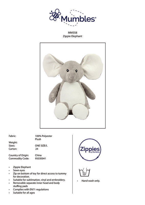 Take a trip to the jungle with our Elephant with its cute contrast coloured cream inners, feet and front panel. Perfect for embroidery and sublimation printing with a zip access at base accessing the tummy and ears .Soft plush elephantContrast cream inner ears, feet and front panelSewn eyesZip access on base for direct access onto the tummy for decorationRemovable inner stuffingZip access to both ears for decoration onto earsCan be embroidered or sublimation printedComplies with EN71 European Toy Safety regulationsRemove all hang tags and their fasteners before giving these items to a childSuitable for children of all agesBSCI certifiedSEDEX certified.Accreditations: Amfori BSCI|SedexAge Group: Infant|KidsFabric: 100% Polyester plushGender: UnisexPlus Size: NoPrint Area: Tummy: 16 x 19cm. Ears: 17 x 15cmProduct Type: Soft ToysSize Range: OnesizeSizing To Fit: One size (46cm)Tag: TaglessWashing Instructions: Hand wash]]>