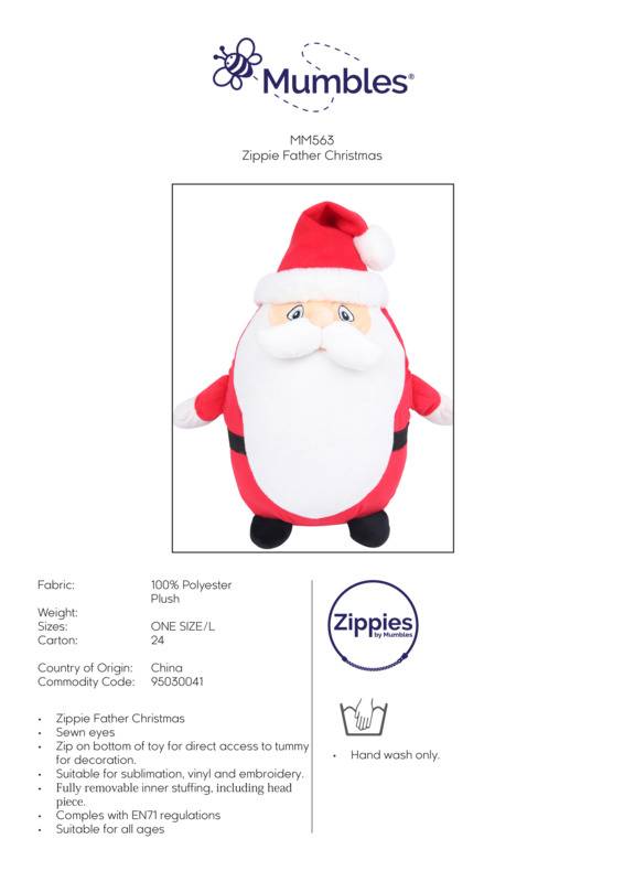 Feeling festive with our Zippie Father Christmas. The plump toy has a wide belt around the tummy, a big plush beard to decorate and a jolly moustache. Designed with zip access around the base for direct decoration access.Suitable for direct decoration onto front panelZip access at bottom of Father Christmas for direct decorationRemovable inner padCan be embroidered, vinyl and sublimation printedComplies with EN71 European Toy Safety RegulationsSuitable for all agesSEDEX certifiedBSCI certified.Accreditations: Amfori BSCI|SedexAge Group: Adult|Kids|InfantFabric: 100% Polyester plushGender: UnisexPlus Size: NoProduct Type: Soft ToysSize Range: OnesizeSizing To Fit: L (35cm)Tag: TaglessWashing Instructions: Handwash]]>