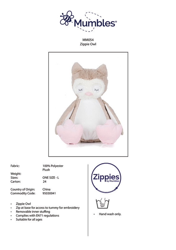 Snuggle up in bed with our plush Zippie owl with its soft contrast pink nose and feet. The tummy is easily decorated with zip access, allowing for embroidery and sublimation printing.Light Brown coloured soft plush owlContrast pink nose and feetCream coloured panel on chest and under wingsZip details on base of owl for direct access onto the tummy for embroideryRemovable inner stuffingComplies with EN71 European Toy Safety regulationsRemove all hang tags and their fasteners before giving these items to a childSuitable for children of all agesBSCI certifiedSEDEX certified.Accreditations: Amfori BSCI|SedexAge Group: Infant|KidsFabric: 100% Polyester plushGender: UnisexPlus Size: NoPrint Area: 15 x 15cmProduct Type: Soft ToysSize Range: LSizing To Fit: L (40cm)Tag: TaglessWashing Instructions: Hand wash]]>